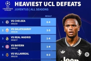 体育资讯2月18日讯 欧冠1/8决赛附加赛首回合,尤文2-5不敌加拉塔萨雷,根据德转统计,本场是尤文在欧冠联赛的第二大惨败,也是首次单场丢5球。
