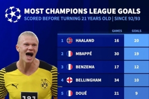 改制后欧冠U21射手榜:哈兰德压姆巴佩居首,本泽马第3、梅西第10